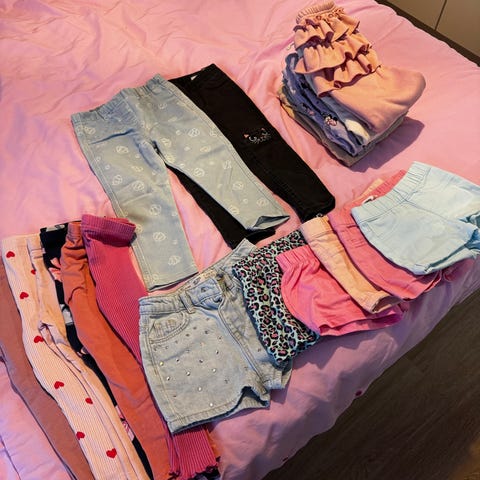 Siistikuntoinen ja ehjä vaatepaketti. Monipuolisesti hyvää käyttövaatetta: t-paitoja, erilaisia housuja, paksuja ja ohuita pitkähihaisia, yöpukuja.