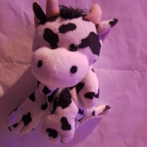 Mustekalapehmolelu, jonka voi kääntää iloisesta vihaiseen. Värit ovat violetti ja vaaleanpunainen. Lelu tuskin ollut käytössä.