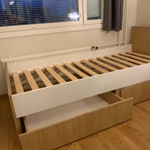 Myyntiin meille uutena ostettu Jyskin Billund sänky, sälepohja ja patja. Patjassa käytetty aina suojaa päällä. Jotain pieniä käytön jälkeä varmasti löytyy. Sängyn alla säilytys laatikot. Patjan koko 90x200cm. L99 x P205 x K75 cm