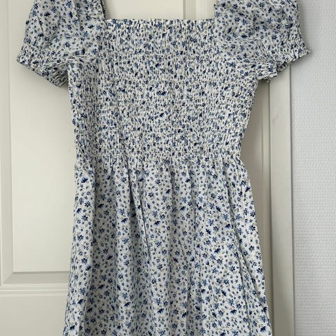 Kerran pidetty ja pesty. Orgaanista puuvillaa. Violetti pohja jossa kukkia. Kauniit puhvihihat, edessä muutamat napit, taskut, leveä drilla helma. Ei ole enää valikoimissa. Mallinukke 36/S kokoa. Olka-helma 98cm, kai-kai 61cm. Ei sovituksia. Ei toridiiliä, en tingi.. Nouto tarkka aika etukäteen sovitusti ma-pe kl. 10-16 hki88 tai postitse (matkahuolto/posti) pakettina.
