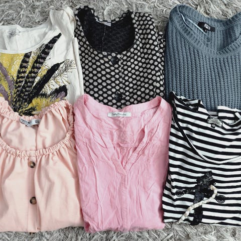 Naisten vaatepaketti 1 kpl valkoinen t paita 1 kpl punainen t paita 1 kpl vireä t paita ja yhden valkoinen pitkähihainen pusero kuvassa näkyvät kaikki 4 kappale yhteensä 35 euroa!