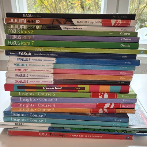 Myytävänä lukiokirjoja. Kirjoissa ei ole merkintöjä. Hinta 2 €/kpl. Jukolan Tekstioppi 10 €.