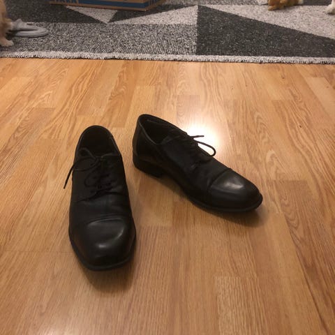 Kuvan mustat Tango merkkiset kengät. Kengissä tuoteseloste missä nahan merkki.