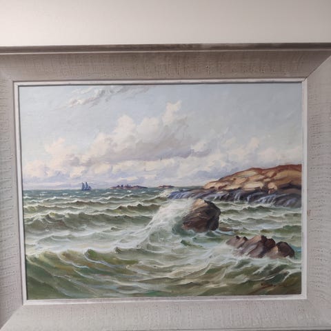 Harvoin tarjolla oleva Oiva Vuolaksen vuonna 1955 tekemä öljyvärimaalaus. Ison merimaisemataulun mitat ovat: korkeus 64 cm, leveys 99 cm.