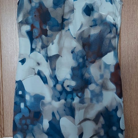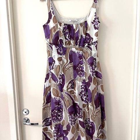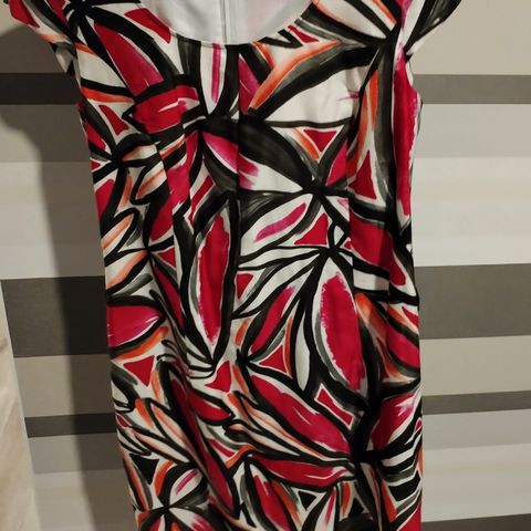 Lindexin puna-musta kevyt mekko, koko 38. Pituus hartiasta etuhelmaan n. 90 cm, takahelmaan 120 cm. Reilut kainaloaukot, etuleveys kainalotasolta 44 cm.