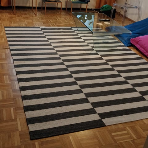 Ostettu keväällä 2022 ja pysynyt todella hyvässä kunnossa. Tuo ihanasti kontrastia ja näyttävyyttä kotiin. Muuten pitäisin, mutta matto on muhkeutensa vuoksi vähän korkea, mikä saattaa pienen esikoislapsen kanssa olla huono yhtälö, kun opetellaan ryömimään ja kävelemään 🤭