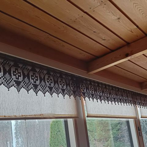 korkeus 86 cm ja leveys 68 cm, ripustettavaksi 3,5 cm korkealla tankokujalla, ei rikkoja tuoksuton, kaksi haaleaa tahraa löytyy ei yritetty poistaa. Arvostavaan kotiin.
