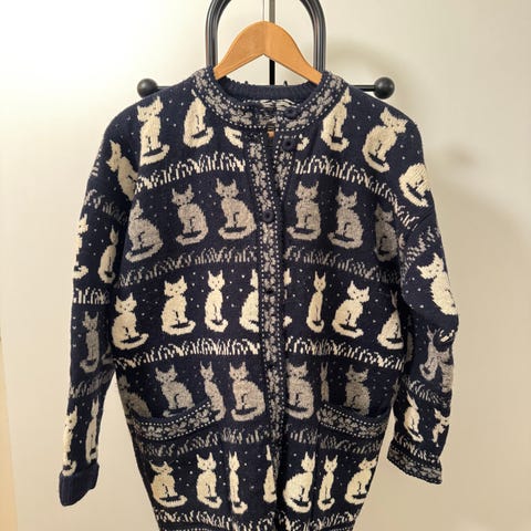 Paksua lämmintä villaa. Ihana kissa kuviointi. Niska-helma 76cm, kai-kai 59cm, kainalo-hihansuu 55cm. Vähän käytetty siisti. Normi käytönjälkiä eli niitä nukkapalleroita voi tietysti olla vähän. Ei sovituksia, ei toridiiliä, en tingi. Nouto tarkka aika etukäteen sovitusti ma-pe 10-16 Hki88 tai postitse pakettina.
