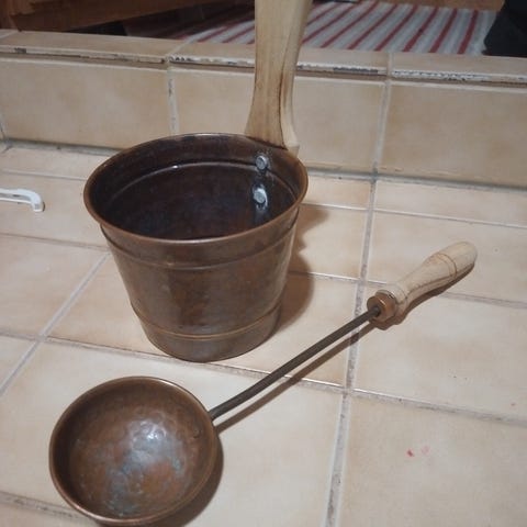 Ruostumatonta Terästä Saunaan Löylyvesi Astia, jossa puu otin, kork.13 cm, suun halk.30 cm, ehjä.