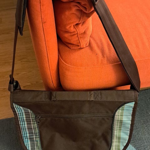 Olkalaukku, koko noin 42x36. Sisäosa jaettu väliseinällä ja kolme muuta lokeroa.