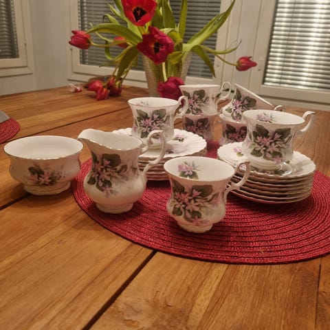 - 27 settiä kahvikuppi (k. 6,5 cm, l. 6 cm) + aluslautanen (12,5 cm).