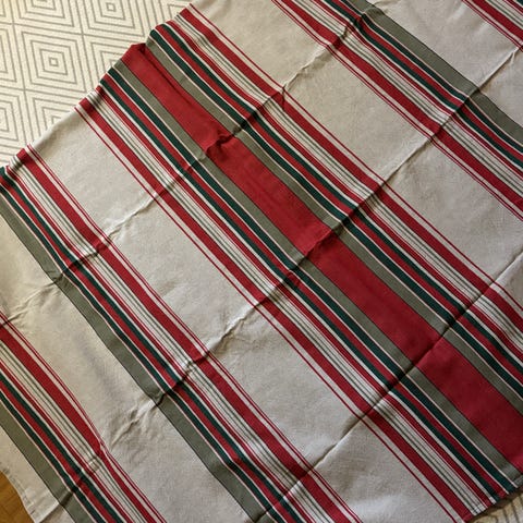 pöytäliina, verho, uusi, koko noin 216 x 140, puuvillaa, kaikki reunat ommeltu, väri puna-vihreä-kulta.