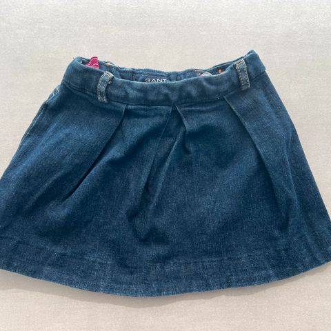 Esprit farkkuhame koko 122cm. Taskut edessä, yksi takana. Vyötäröllä vyö. Takana kukkakirjailu.