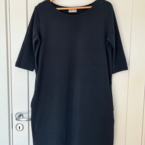 Ethän tingi. Mustaharmaa raidallinen tasaraita mekko luomupuuvilla koko L. Joustaa ja on reilu, L kokoa käyttävälle kyllä mahtuu. Ollut esittelyssä pari kertaa päällä.