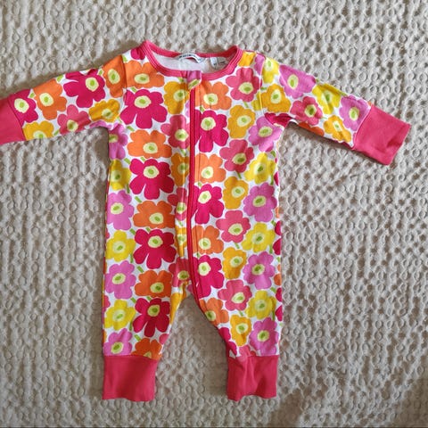 Marimekon punasävyinen Kissanpäivät body, pitkä hiha, kaula-aukossa 1 neppari.