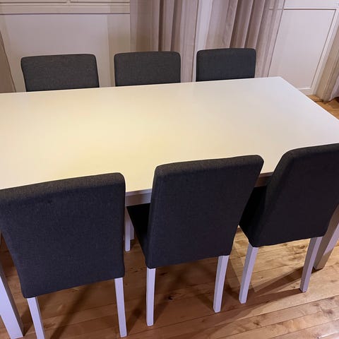Pöytä ja kuusi tuolia.mäntyä, lakattu pinta, ei juurikaan käytön jälkiä, tukeva, koko 200x75 korkeus 70, voin myydä tuolit ja pöydän erikseen