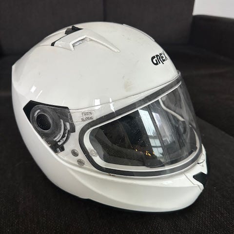 Myyntiin tarpeettomana hyväkuntoinen GREXin kypärä G1.1, koko S eli noin 54-56. Avomalli visiirillä, kunto näkyvissä kuvista.