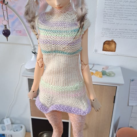 Mallina toimivien nukkejen rinnanympärykset ovat 24 ja 23 senttiä ja neule venyy ainakin noin sentin verran lisää ennenkuin neulos näyttää venytetyltä. Sopii hyvin myös esimerkiksi feeple65 vartaloiselle nukelle.