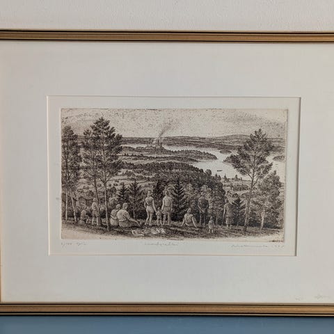 Työ ja kehykset hyvässä kunnossa, sellaisenaan ripustusvalmis.