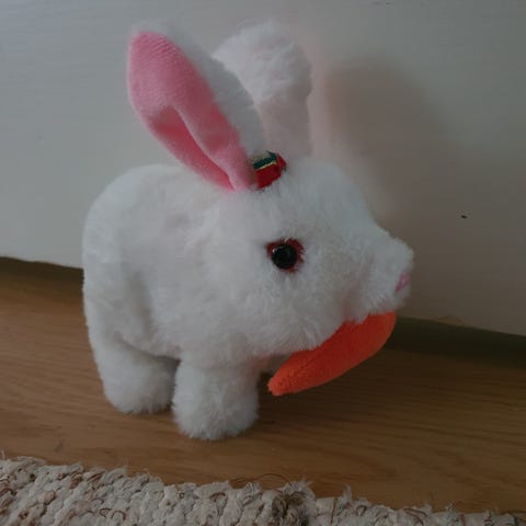 Vaaleansininen Hännästä vedettävä soiva pupu(soittorasia sisällä) sopii hyvin vauvalle ns mobiiliksi. Soittaa tuutulaulua.