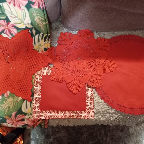 Puna sävyisiä, pieniä, pyöreitä Pöytäliina, joissa on virkatut reunat, halkaisija 25 cm, ehjät.