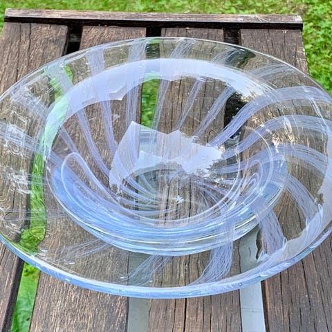 Myydään kaunis vaalean lilanvärinen kuvioitu, käsintehty taidelasilautanen.