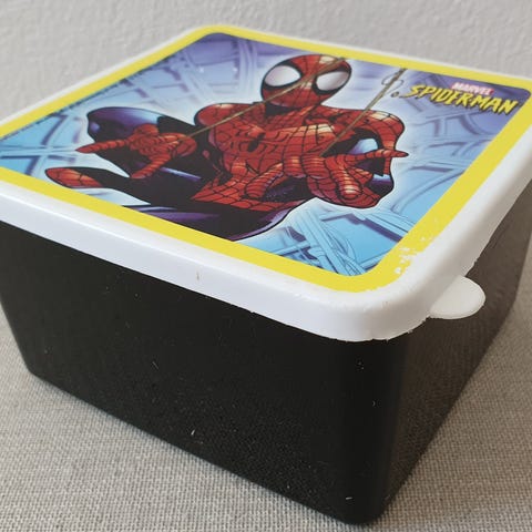 Peltinen Hämähäkkimies / Spiderman roskis, joka on reunasta vääntyillyt. Muuten ehjä, kuvat hyvässä kunnossa, paperi roskiksena ollut. Korkeus 28cm, halkaisija ylhäältä 22cm.