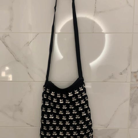 Käsityönä valmistettu kaunis kassi. Mukana irroitettava vaaleanpunainen kukka. Vahvat puiset kannattimet. Hinta 29€, noutaen.