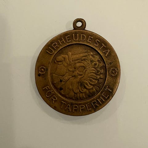 Etupuolella teksti “URHEUDESTA – FÖR TAPPERHET” sekä Suomen vaakunaleijona.