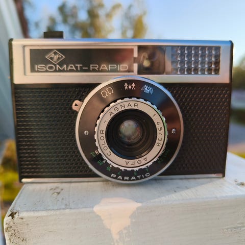 Agfa Isola I -kamera koteloineen 50-luvulta. Sekä kamera että kotelo ovat ulkoisesti erittäin hyvässä kunnossa ja jäänyt aikoinaan lähes käyttämättömäksi. Kamerassa on manuaalinen tarkennus, kaksoisvalotuksen esto sekä sisäänrakennettu keltainen suodin.