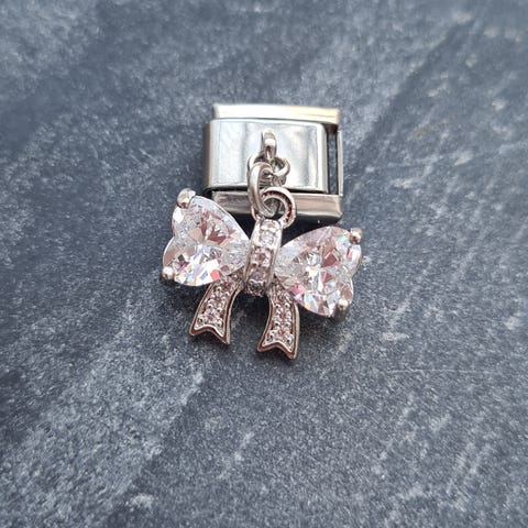 Nomination Classic rannekoruun sopiva koristeellinen korupala. Kullanvärinen. Materiaali kullattu messinki ja ruostumaton teräs. Keskellä vaaleanpunainen "kivi". Reunoilla koristeena kirkkaita zirkonioita. Ei aito Nomination.