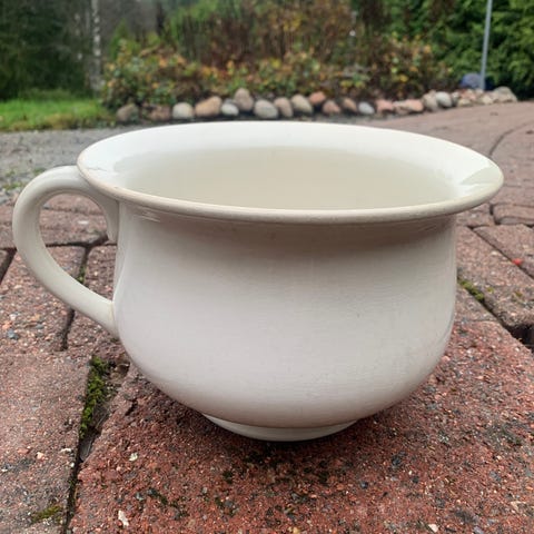 Valkoinen posliini-kuppi, jonka korkeus noin 7,5cm ja halkaisija yläreunasta noin 8,5cm. Ruotsalaista posliinia. Pohjassa tehtaan leima, sekä tekstit ” DESIGN FÖR APOTEKEN AV STIG LINDBERG ” ja ” VDN S 555 ”.