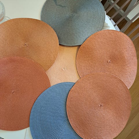 8 kpl harmaita pöytätabletteja. Materiaali 100% puuvilla. Nämä uusia ja 1e kpl. Koko 47x32cm.