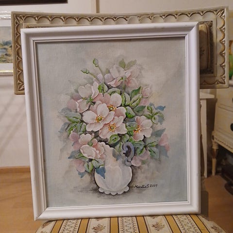 Maalauksen laidoilla pientä kuprua. Vaatisi kehysten avaamisen ja työn uudelleen laittamisen kehyksiin niin kuprut saisi pois.