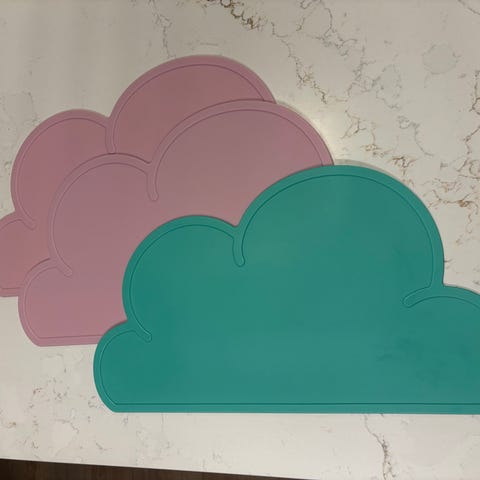 Kuvissa 3-5 näkyy myynnissä olevat kolme ruokailualustaa. Hinta on kaikista kolmesta yhteensä. Ruokailualustojen teemat ovat kuvat, tanskan kieliset sanat ja englannin kieliset sanat.