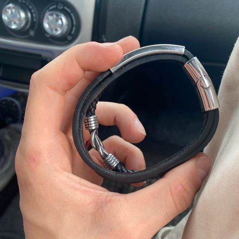 Vähän käytetty nahkarannekoru. Infinity koristeella. Pituus 22 cm ensimmäisellä napilla ja roisella 20 cm.