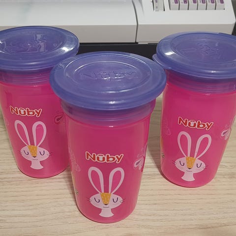 Nuby ihmemuki / wonder cup ja ylimääräinen, punainen kansirinkula. Vihreät ja läpinäkyvät kansiosat ovat uutena ostettuja ja yhdellä lapsella käytettyjä (niiden kanssa ostettu mukiosa ei ole enää tallella). Mukiosa ja punainen kansirinkula ovat olleet enemmällä käytöllä.