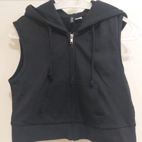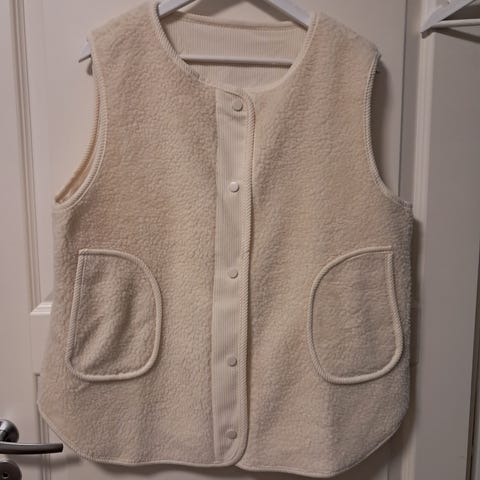 Ihana käyttämätön pitkä napitettava hihaton liivi, ylettyy pohkeisiin melkein nilkkoihin asti. Halkiot sivuissa. Voi pitää auki tai kiinni. Joustavaa kangasta ja kietaisuvyö.