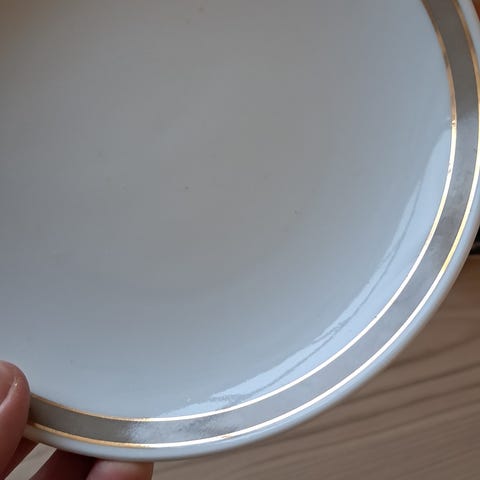 Raija Uosikkinen. Yhdessä lautasessa pieni rikko alapuolella.