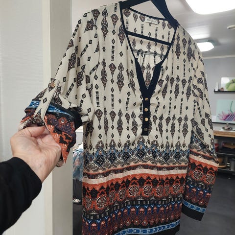 Valkoinen, ohutta kangasta, koko 38, materiaali 100 % polyesteria, 69 cm edestä mitta, mitta olalta helmaan 65 cm, siisti ja ehjä.