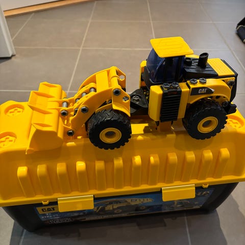 Osista koottava CAT nosturi ja trukki ohjeineen sekä kolme nosturin tarviketta. Kerran rakennettu valmiiksi ja sen jälkeen ollut lähinnä koristeena. Kuvassa narut luistaneet irti solmuista.