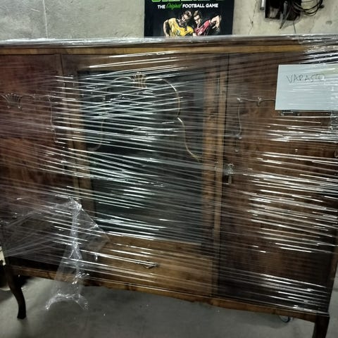 Monikäyttökaappi, jossa laatikoita, avohyllyjä ja vitriinitläosa liukuovilla. Ostettu Helsingista Country White nimisestä liikkeestä.