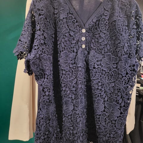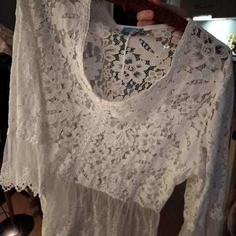 Myynnissä valkea pitsipusero, venyvää mateilaalia, vetoketju selässä, malli Vila, koko XL, hinta 20 euroa + postikulut