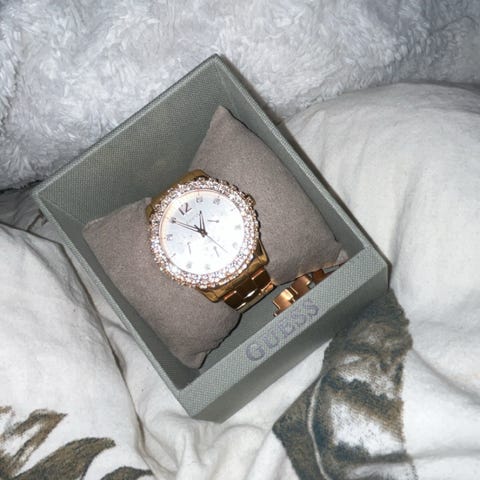 Kaunis hopean sävyinen rannekello teräsrannekkeella ja näyttävällä zirkoniakoristelulla. Kellotaulussa on myös päivyri. Erittäin hyväkuntoinen (kellotaulussa ei ole naarmuja tms. käytön jälkiä). Nykyisellään ranneke on mitoitettu kapealle ranteelle, mutta kaikki rannekkeen palat on tallella, joten rannekkeen saa kultasepällä säädettyä itselleen sopivaksi. Ostettu muutama vuosi sitten, mutta ei ole ollut käytössä montaa kertaa. Tarkka ostopäivä ei ole tiedossa. Uutena maksanut noin 200 euroa.