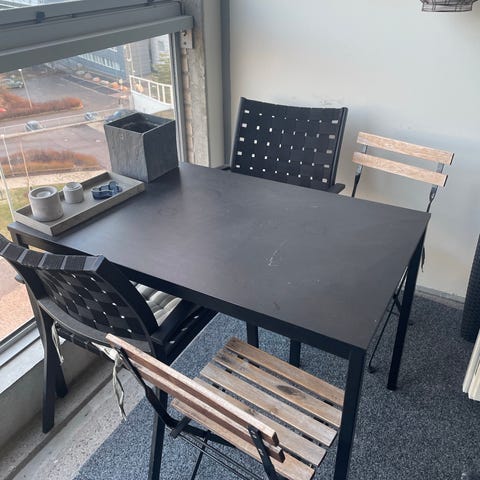 Ikeasta ostettu puinen pidennettävä musta pöytä Bjursta. Hyvässä kunnossa, pöytäliina ollut aina päällä. Yhdessä jalassa pieni kohta, josta lähtenyt pieni pala (kts. kuvat)