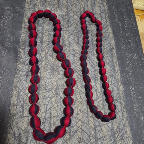 Kankaalla päällystetyt puiset helmet. Värit: violetti ja punaruskea.