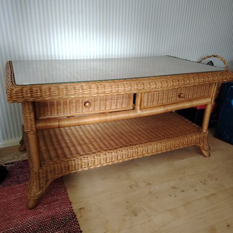 Pieni Polyrottinkinen sohvapöytä lasipäällisellä. Leveys 73,5, syvyys 45, korkeus 38cm. Lasilevyn kulmassa muutaman millin lohkeama.