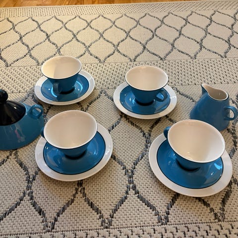 Seitsemän kappaletta Arabian turkooseja Harlekin-sarjan tasseja.
