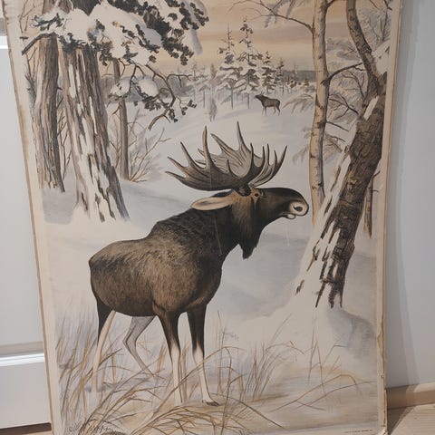 Lasisessa vaihtokehyksessä oleva saksanhirvi (?) painokuva. Kuvassa valon taittumisen vaikutuksesta kiilto-ominaisuus. Kehyksen koko 24x30 cm, kuva 15,5x21 cm.