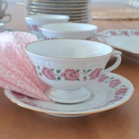 Myyn vähälle käytölle jääneet ruusukupit (6kpl) lautasineen. Kermakko ja sokerikko löytyy myös. Kaikki kerralla ja yhteishinta 40€. Noutona myyn.